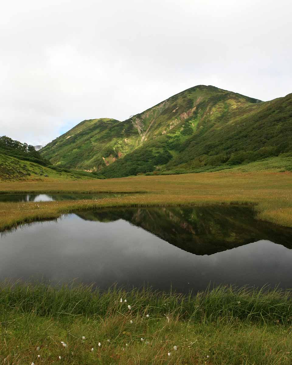 山頂直下の天狗の庭と呼ばれる湿原は、池に火打山が映り撮影スポットにもなっている。