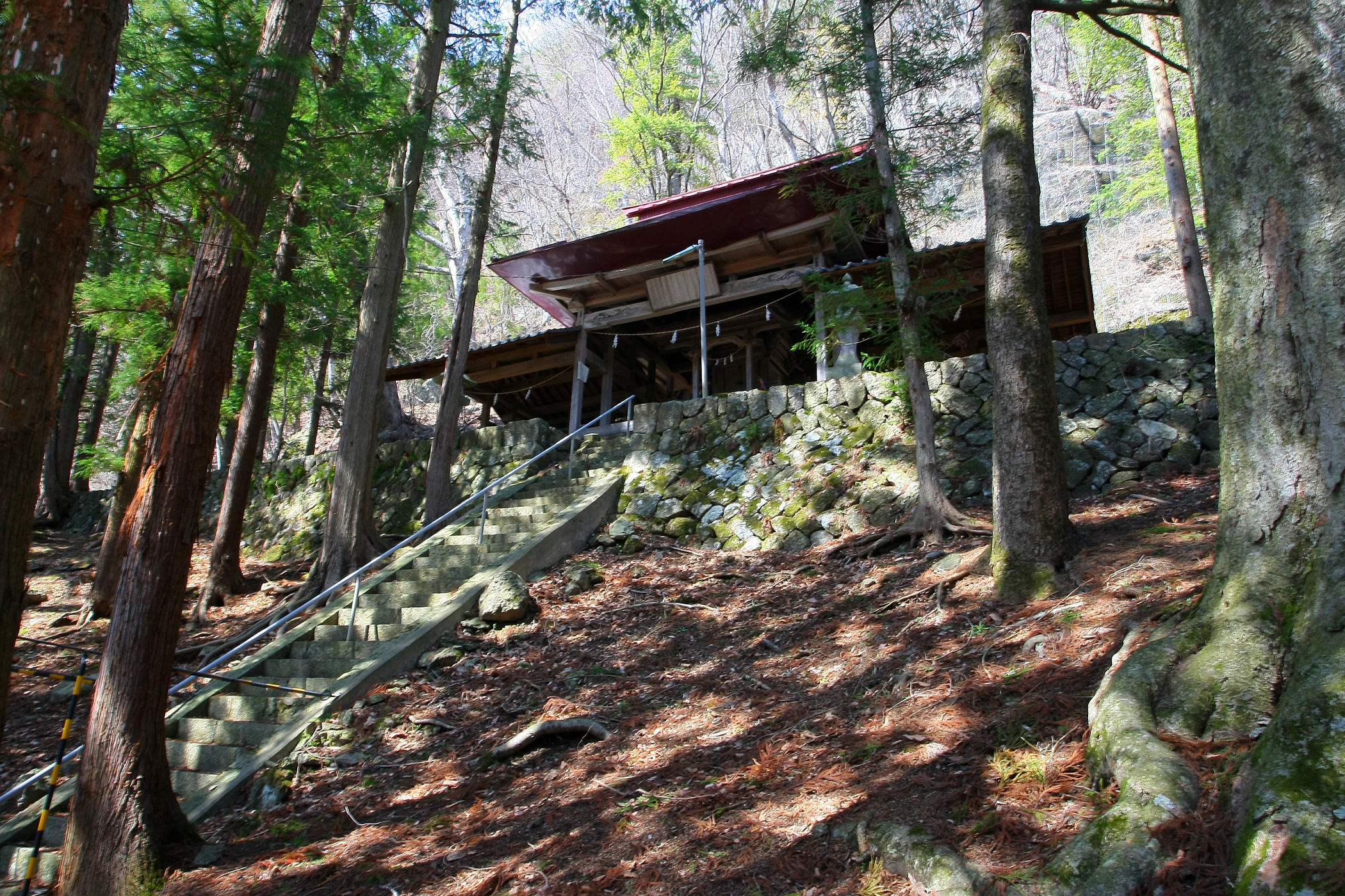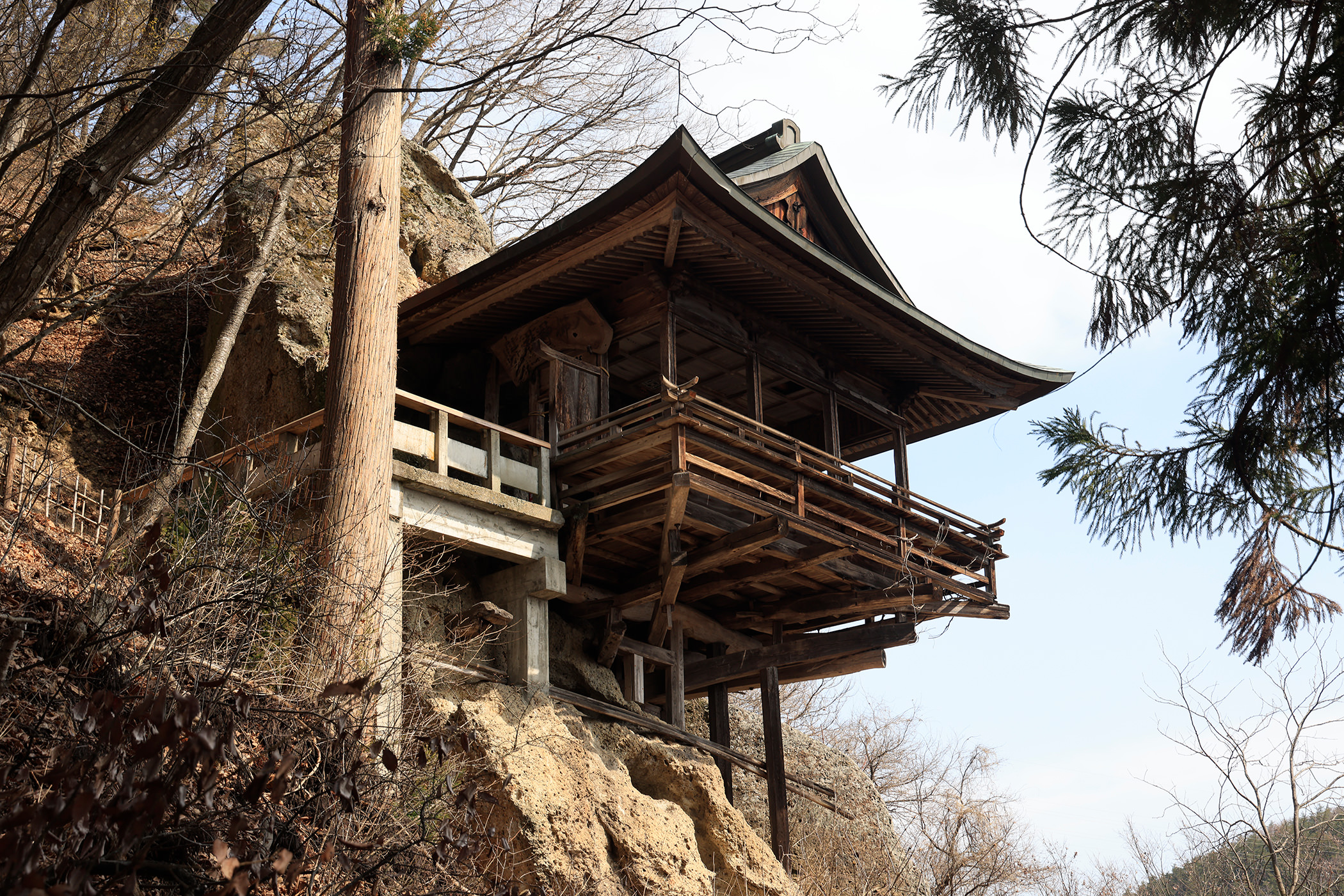 ただその中腹には社殿があり、岩壁に張りつくような造りに目が留まる。