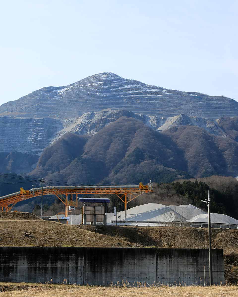 石灰岩質の土質で山の北側はセメントの採掘のために削られ、植物は一切なく人工的な段差が見られる異様な山容を見せる。
