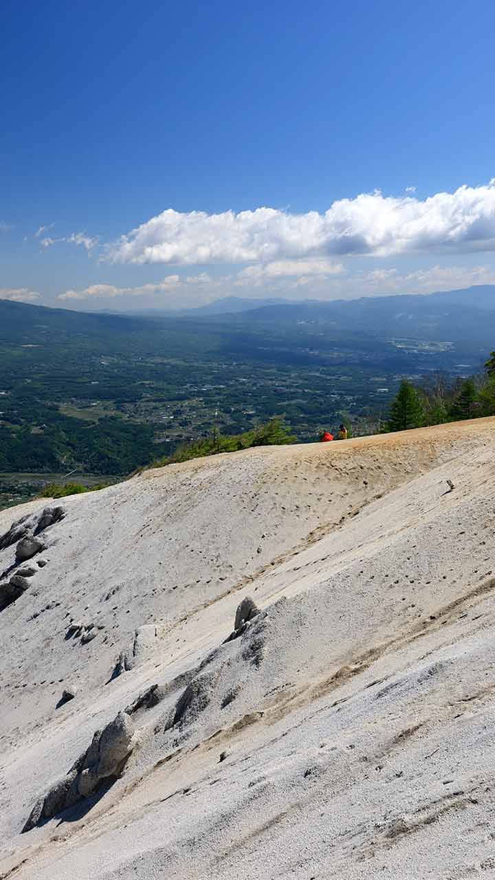 主脈から伸びた尾根の先にあり、山頂近くの雁ヶ原と呼ばれる白砂の山肌で知られる。
