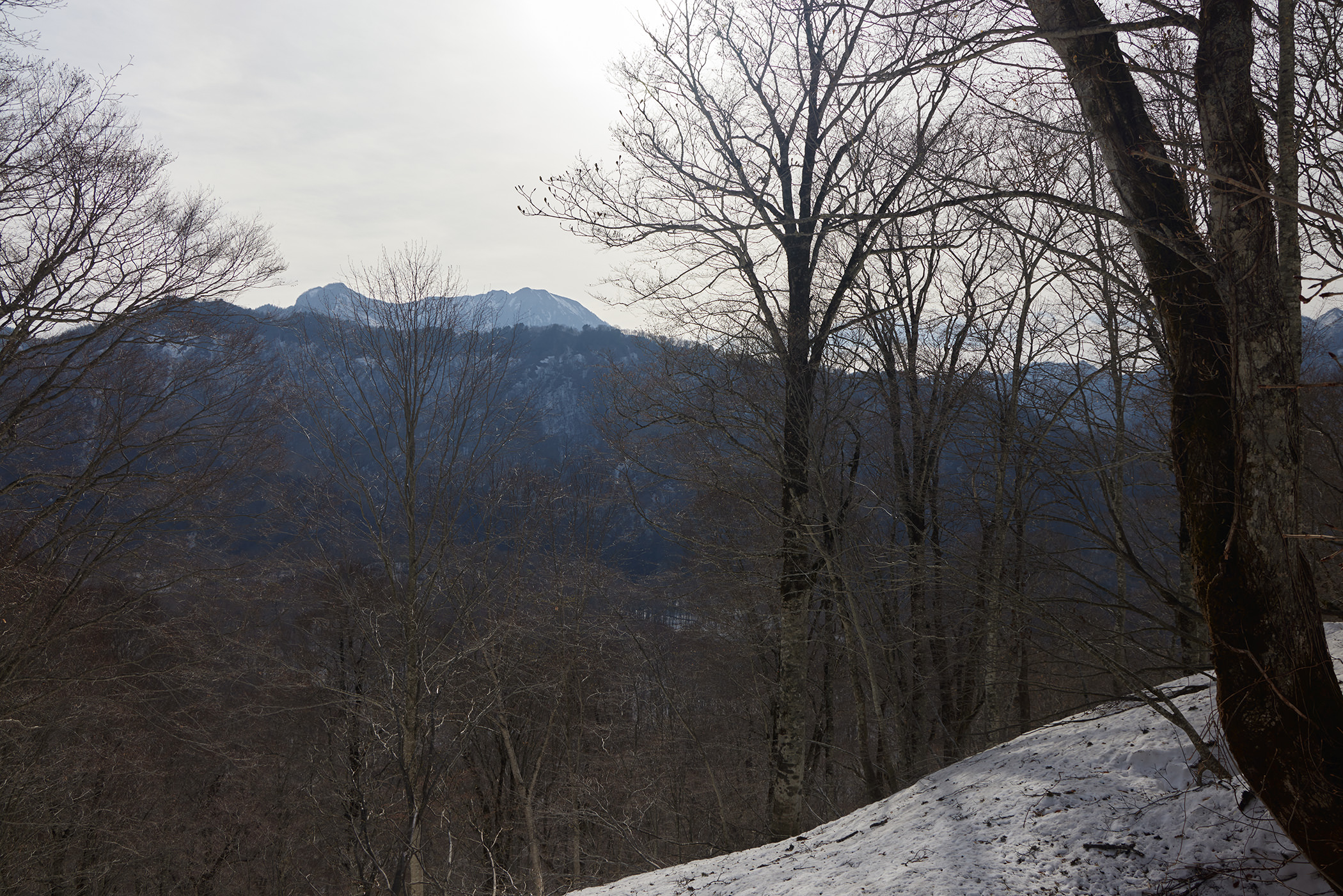 斜度が緩まったところで足を停めて振り返ると、木々に覆われていた眺望が開け、疎らな枝の向こうに高妻山が見える。