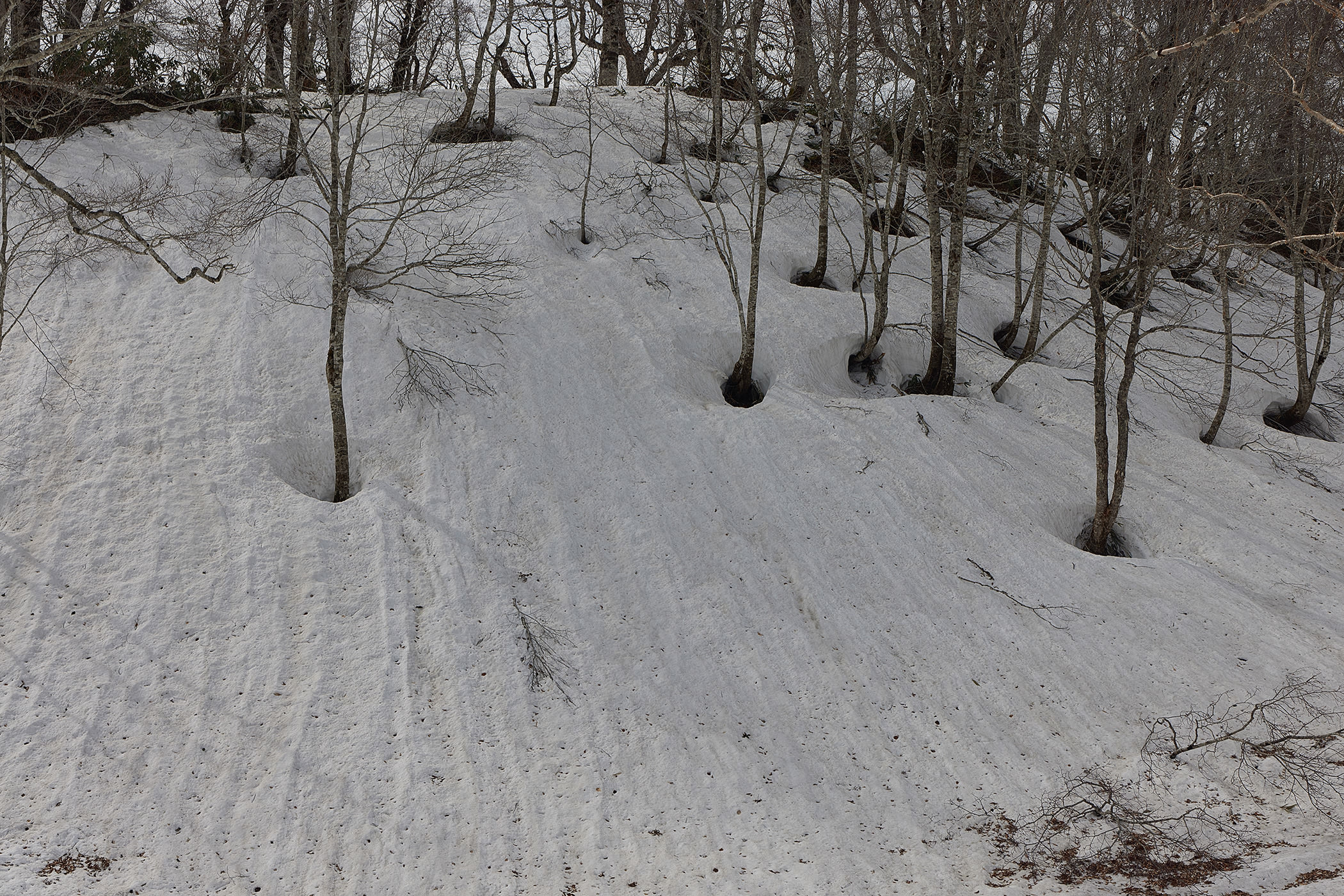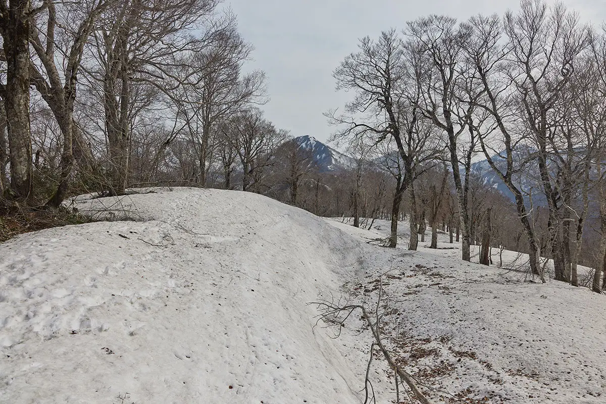 ひたすらに雪の上を歩き続けるコースで、ほんの数メートルだけ雪が切れて藪に入る場所はあったものの、ほぼ同じ状態が続く。
