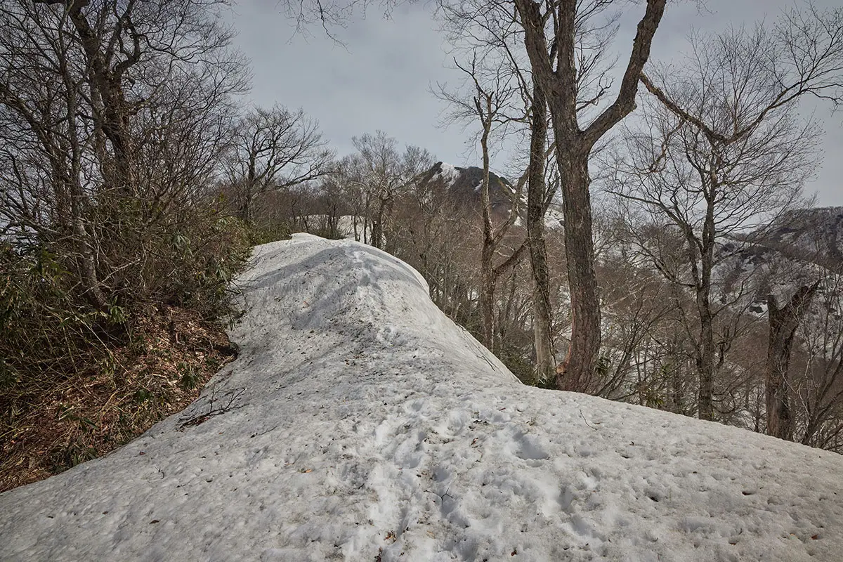 広くなっていた尾根は、雪が無くなった分だけ狭く、両側が切れ落ちた痩せ尾根に変わった。