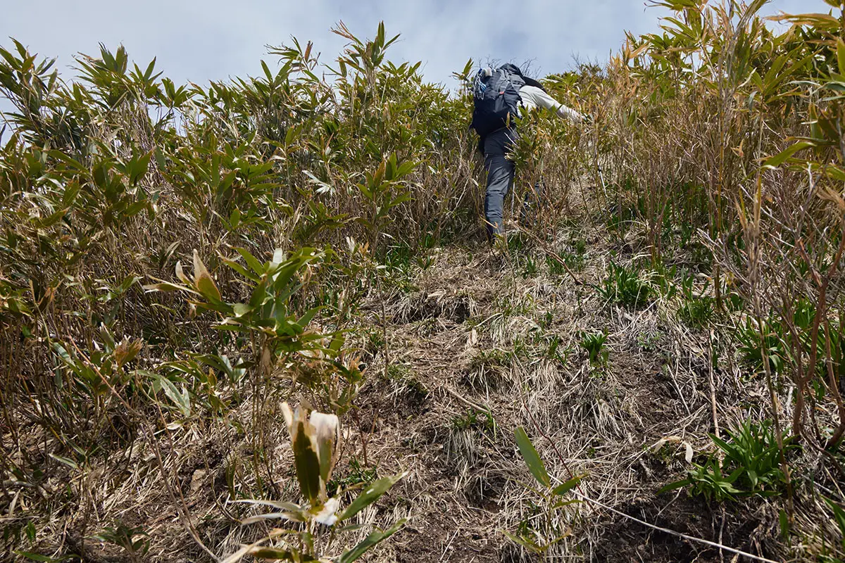 整備された登山道は無く、厚い笹藪が尾根を覆う。