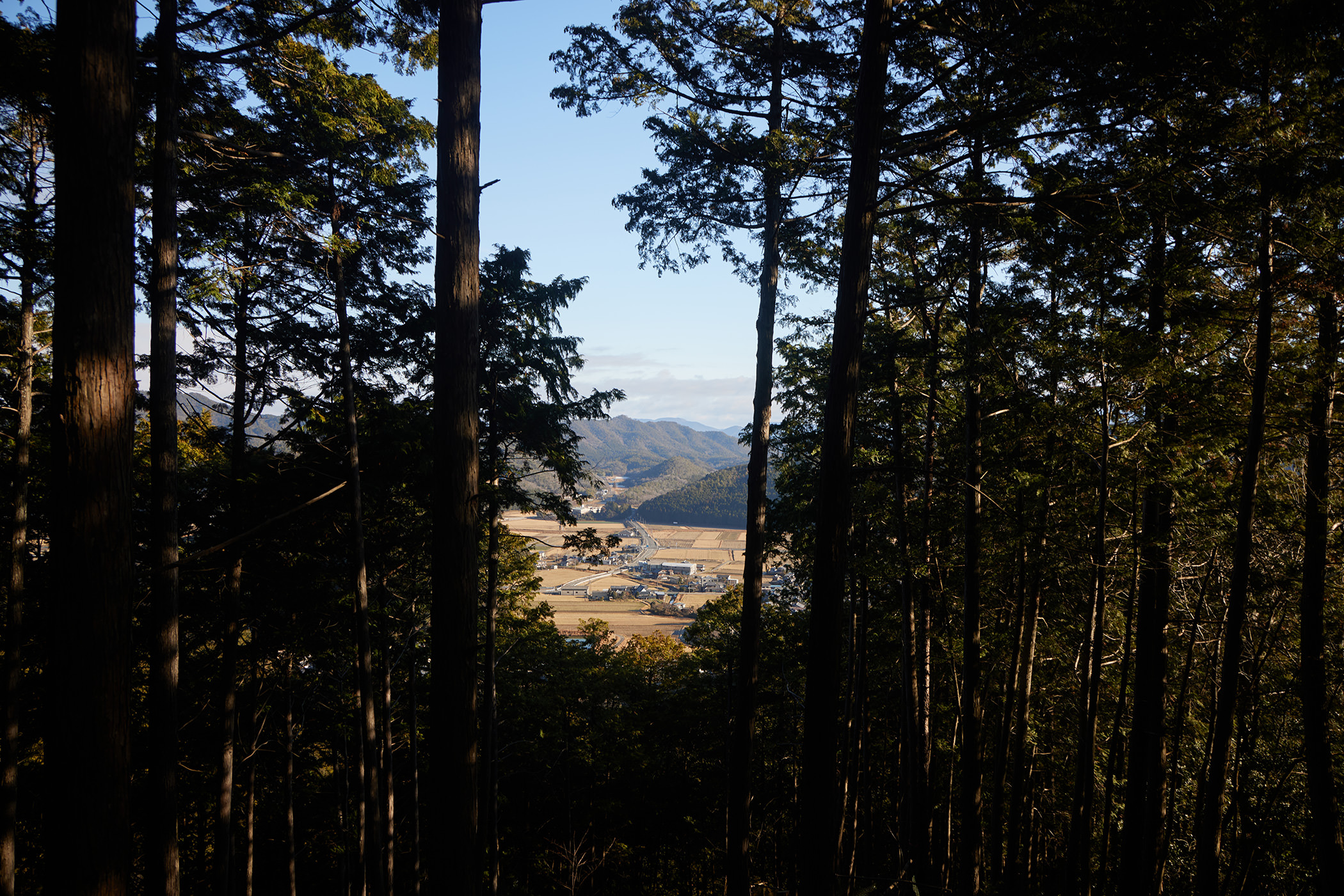 木々が開けているところがあったので、そこから景色を覗いて見ると、まだ間近な距離で麓の田畑が見えた。
