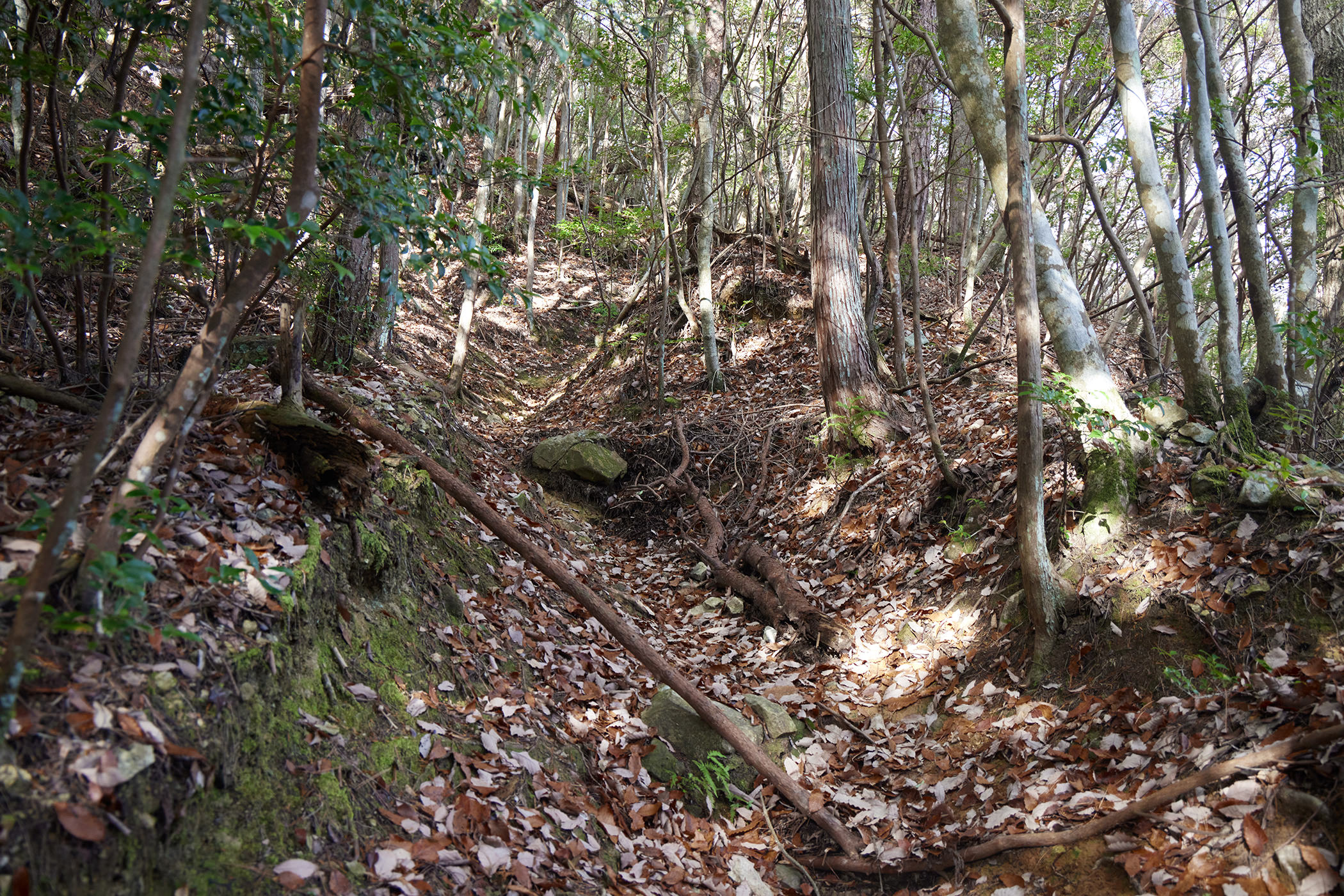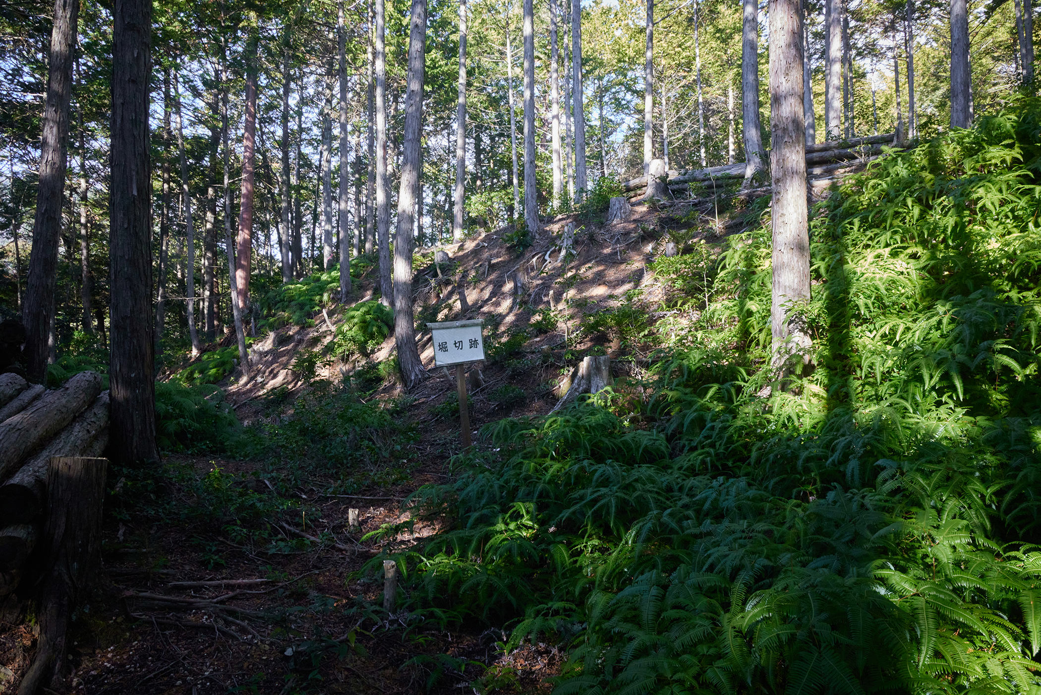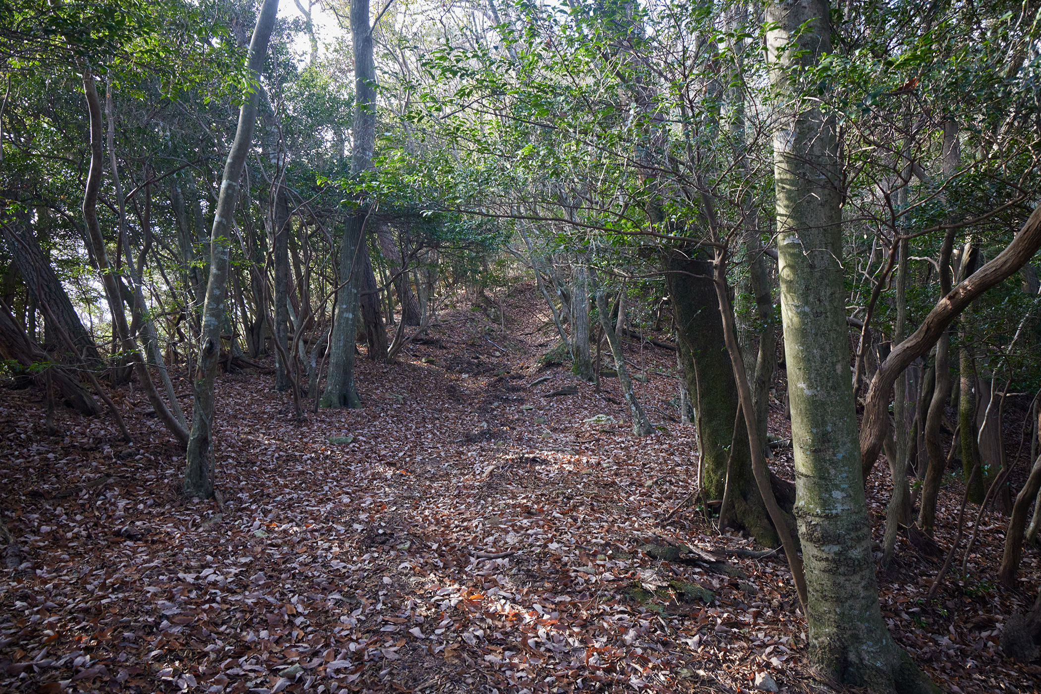 金輪寺から5分ほど登ると、登山道から外れた窪みに堀切跡と書かれていた。