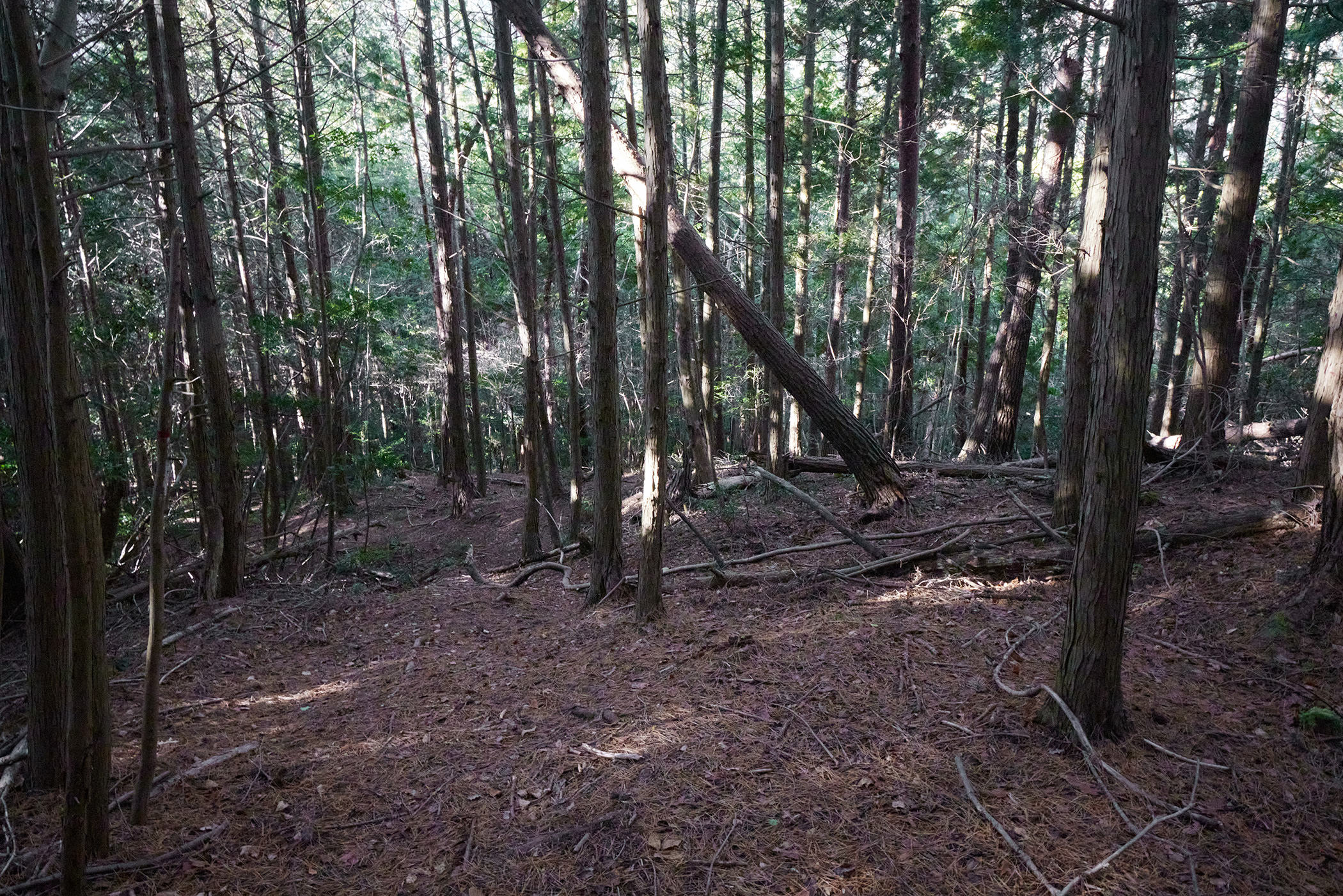 神尾山城跡から少し登ると平坦になり、ピークを越えたようで登山道は下りに変わった。