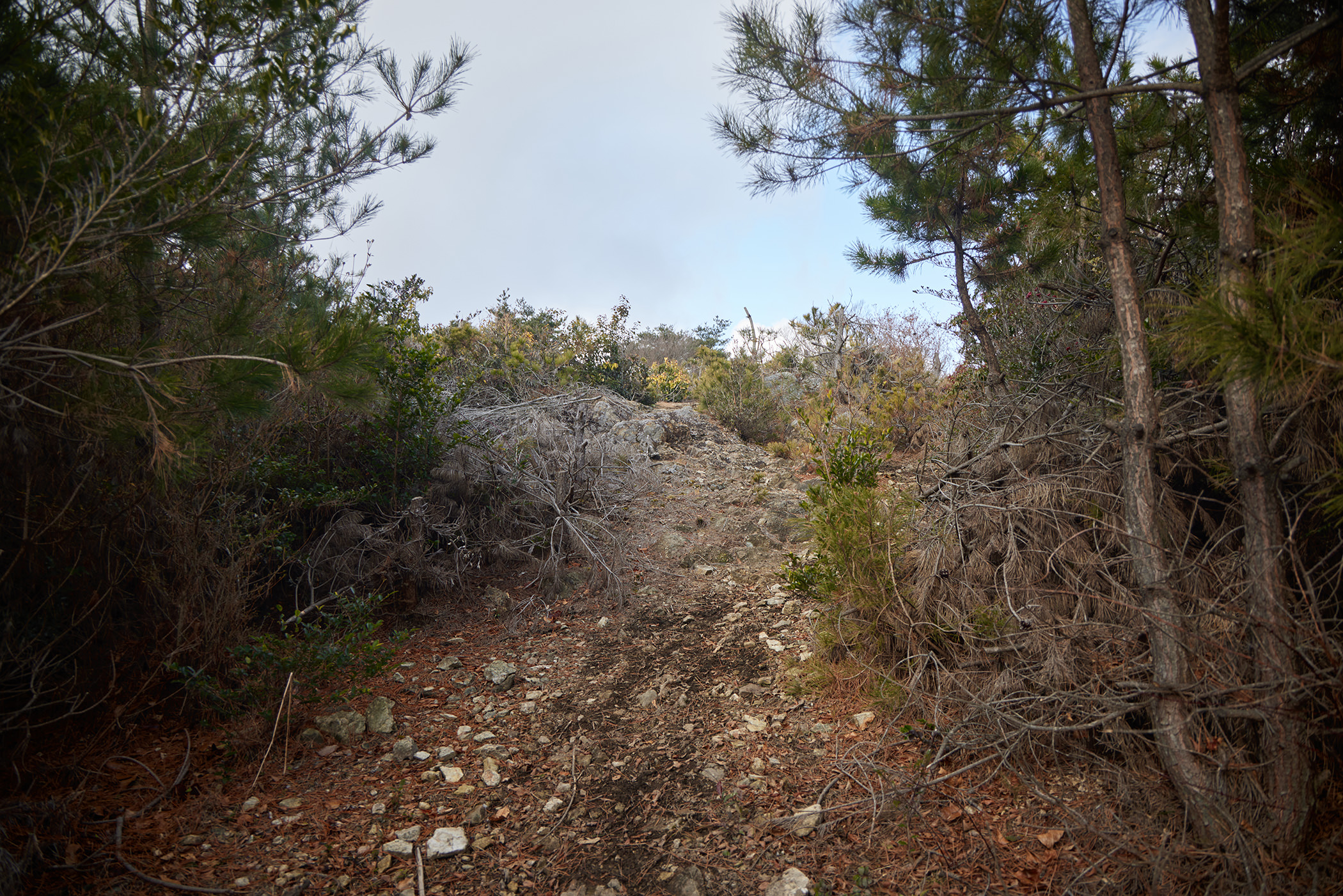 登り返してから10分ほどのところで、斜面を折り返していた登山道から尾根道になり、それも数分登っていくと間近に見えるピークの直下を横切るように変わった。