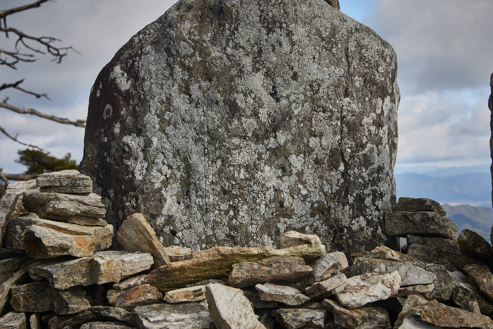 藪がまったく見当たらず、そういう山なのか踏み跡が辿れているのかと迷いが出てきたころ、山名の書かれた矢印が建っていた。
