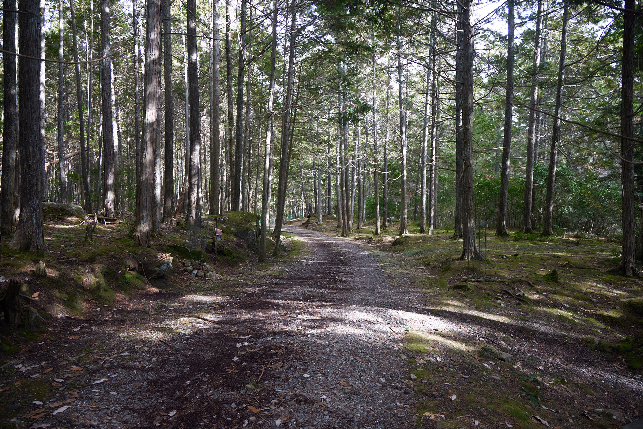 石と段差の登山道がようやく終わり、未舗装の林道を下りる。
